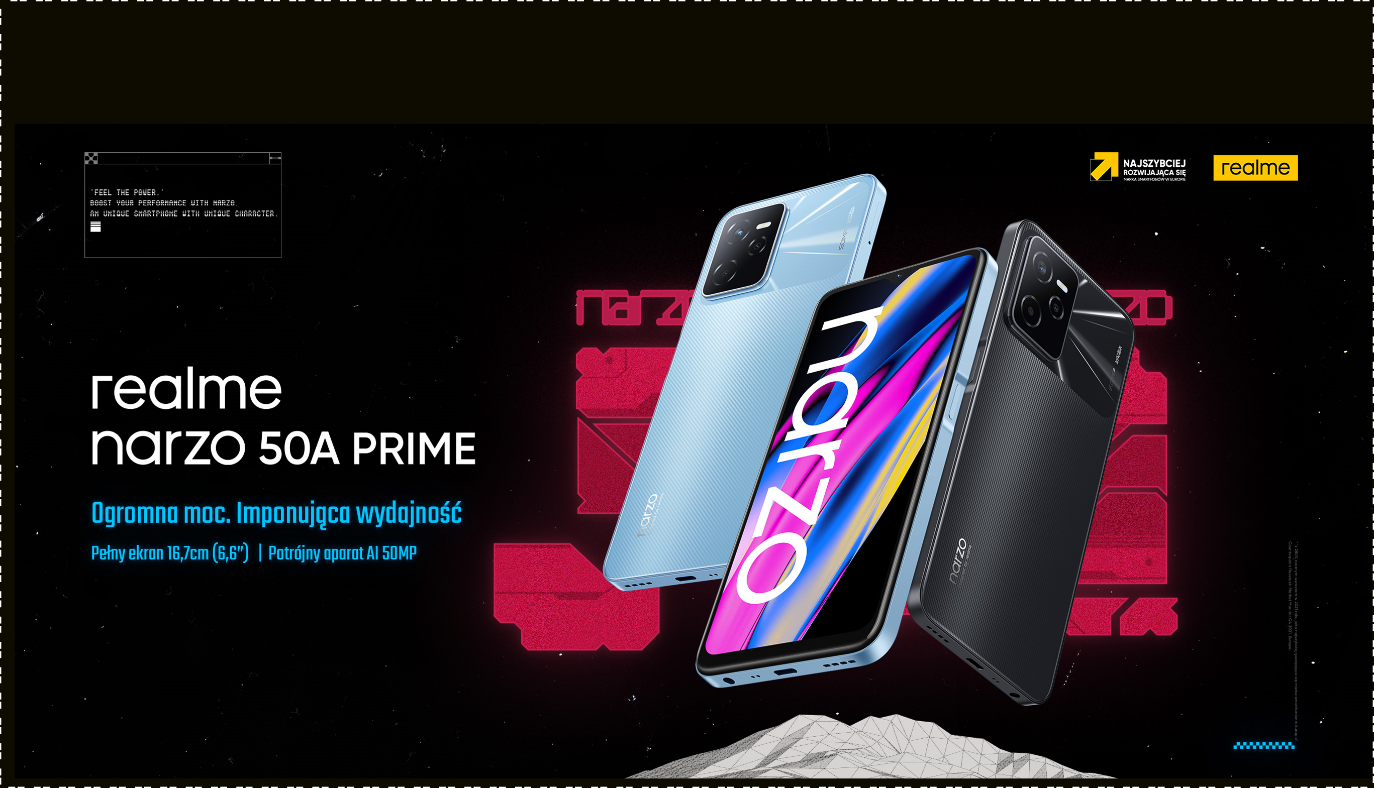 Warszawa, 18.05.2022 r. – realme, najszybciej rozwijająca się marka smartfonów, wprowadza na polski rynek dwa nowe smartfony: realme narzo 50 oraz realme narzo 50A Prime. Pierwszy model został wyposażony w wydajny procesor MediaTek Helio G96, który docenią entuzjaści gier mobilnych, ekran z częstotliwością odświeżania 120 Hz oraz potrójny aparat 50MP AI. Natomiast drugi z nich, realme narzo 50A Prime, charakteryzuje się stylowym designem, który wyróżnia go na tle konkurencji w swojej kategorii cenowej. Dzięki nowej konstrukcji z ramką pod kątem prostym, która ma zaledwie 8,1 mm grubości, zapewnia wyjątkowe wrażenia wizualne oraz komfort użytkowania.